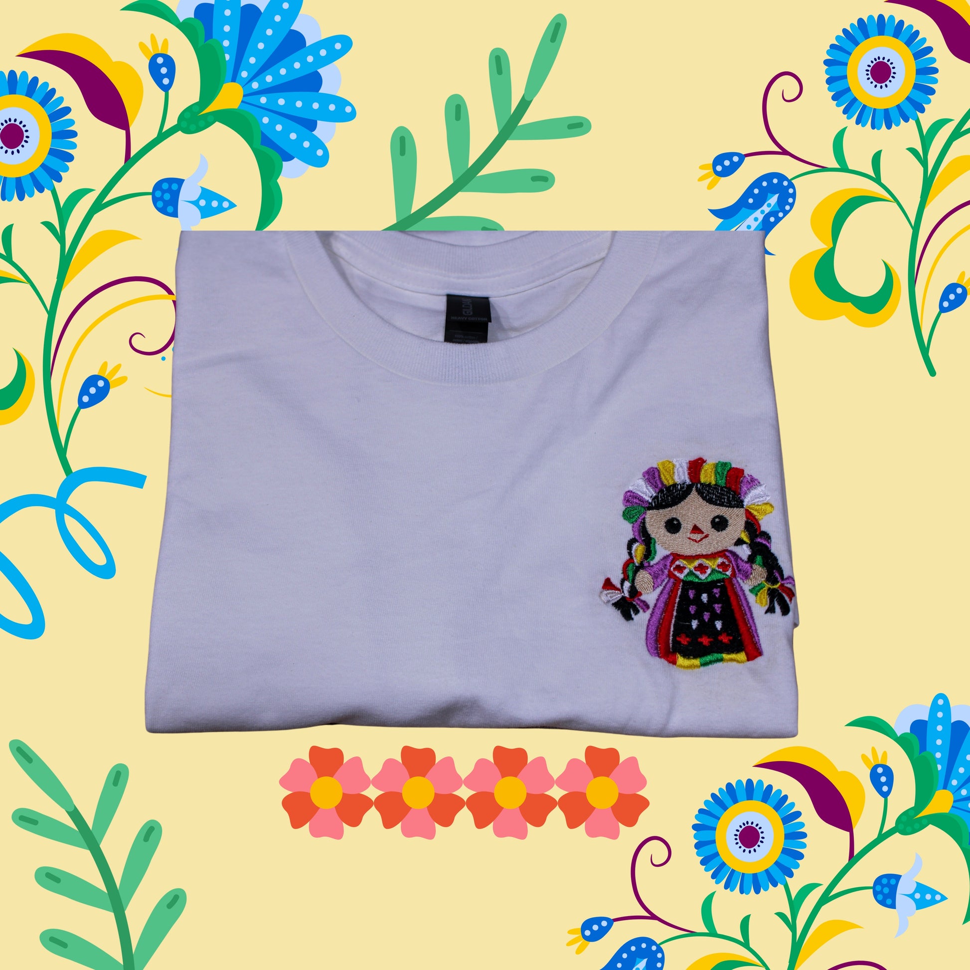 Embroidered Mexican Rag Doll on White Gildan 100% cotton crew T-Shirt